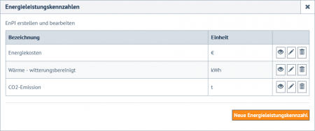 Klicken Sie in der Kennzahlenübersicht auf die Schaltfläche "Neue Energieleistungskennzahl", um mit der Konfiguration einer neuen Energiekennzahl zu beginnen.
