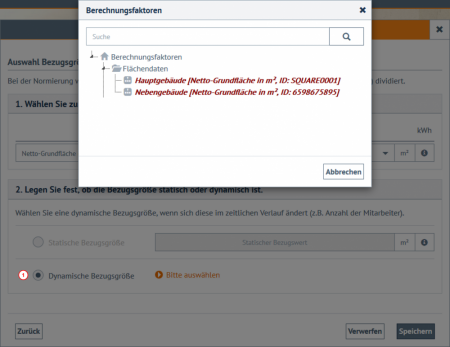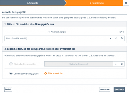 Wählen Sie in Schritt 1 eine der verfügbaren Bezugsgrößen (hier im Beispiel "Netto-Grundfläche (NGF)") und wählen Sie dann in Schritt 2 die Option "Dynamische Bezugsgröße".