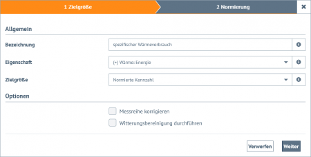 Legen Sie zunächst einen Namen für die zu berechnende Kennzahl fest. Wählen Sie dann eines der verfügbaren Zählwerke des Zählers sowie eines der möglichen Berechnungsverfahren aus. Im Beispiel soll der flächenbezogene Wärmeenergieverbrauch berechnet werden. Es wird somit das Zählwerk "(+) Wärme - Energie" und das Verfahren "Normierung" gewählt.